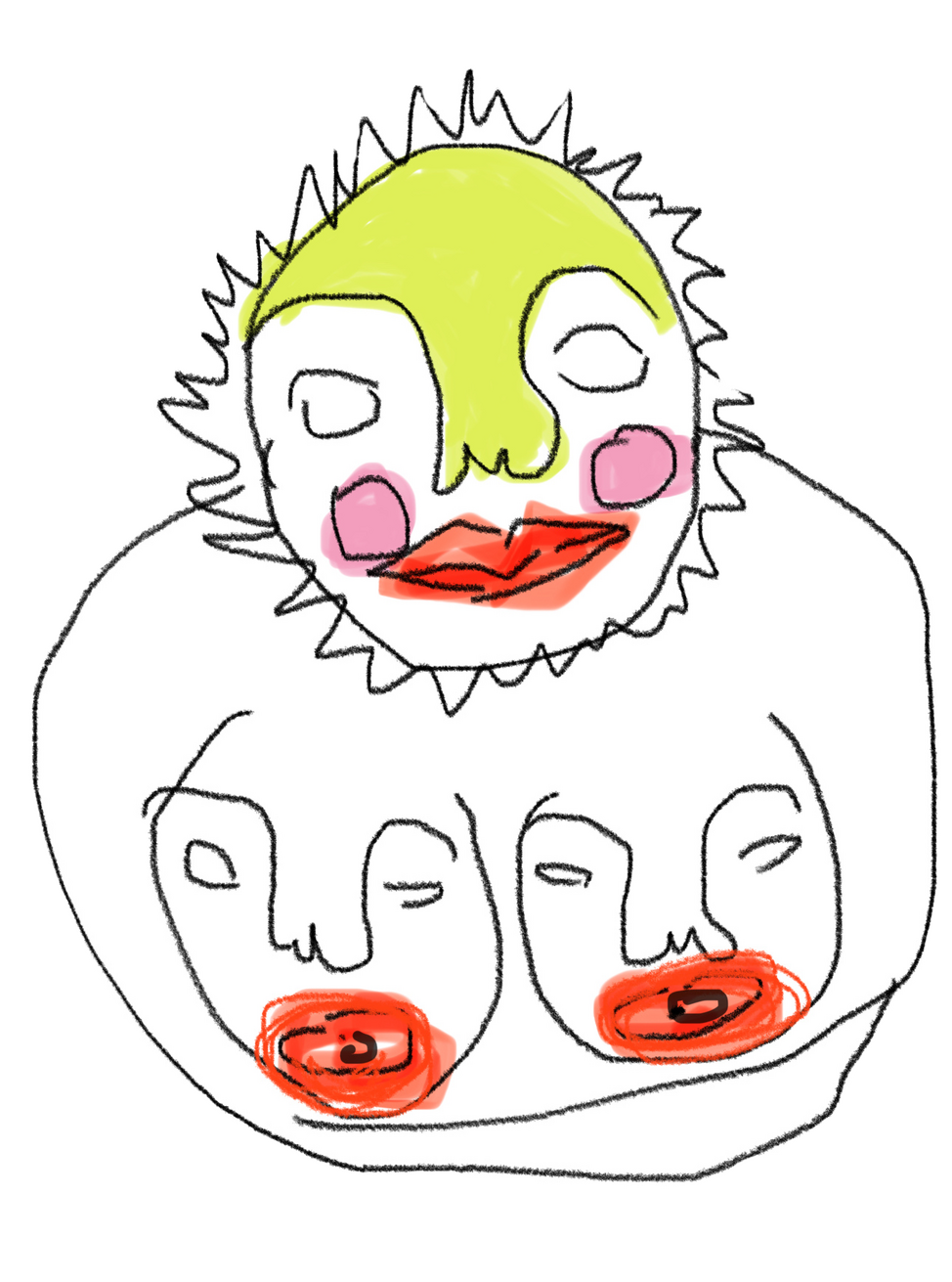 buttons, embroidery thread, found and second-hand linen, lace, packagingThis embroidered bicephalous face mask serves as a meditation on Doherty's struggle with bipolar disorder and performativity. The mask gestures towards duality in identity and flipping from high to low both in materiality and mental state. The work focuses on cycles within humanity, production and consumption, collecting and purging, as well as the cycles of mania and depression experienced in bipolar disorder. Ritual making is a part of the artist’s process as hyper productivity happens during periods of mania. Packaging like the mask is the alluring protective layer, a talisman of protection of liminal identity.