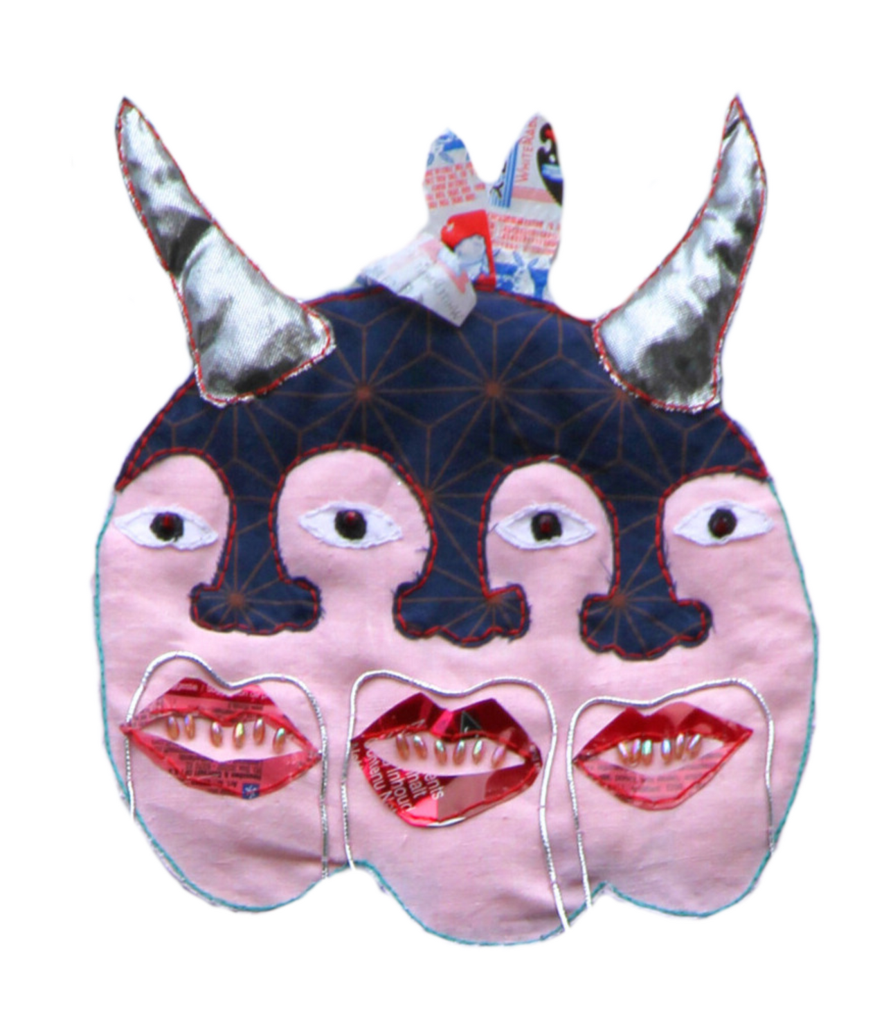embroidery thread, found and second-hand fabrics, glass beads, lace, metal wire, packagingAn embroidered version of a Lega Bwami Tricephalous-face mask (Zaïre, now the Democratic Republic of Congo).The original version of the mask was traditionally used in rituals to mark the transition into higher levels of Bwami society. This version is a meditation on multiplicity in identity; these hand-sewn mask gestures toward material hierarchies by utilizing high and low materials embroidered with a chain stitch to signify being trapped in performative cycles. The mask plays with the notions of high and low as performative opulence can be seen as a symptom of colonial trauma.