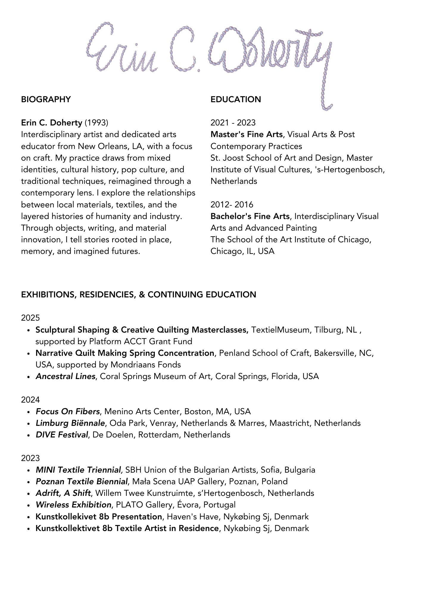 buttons, embroidery thread, found and second-hand linen, lace, packagingThis embroidered bicephalous face mask serves as a meditation on Doherty's struggle with bipolar disorder and performativity. The mask gestures towards duality in identity and flipping from high to low both in materiality and mental state. The work focuses on cycles within humanity, production and consumption, collecting and purging, as well as the cycles of mania and depression experienced in bipolar disorder. Ritual making is a part of the artist’s process as hyper productivity happens during periods of mania. Packaging like the mask is the alluring protective layer, a talisman of protection of liminal identity.